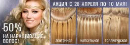 -50% на наращивание волос: ЛЕНТОЧНОЕ, КАПСУЛЬНОЕ, ГОЛЛИВУДСКОЕ ТРЕССОВОЕ. Акция распространяется на работу мастера. 28.04.2017